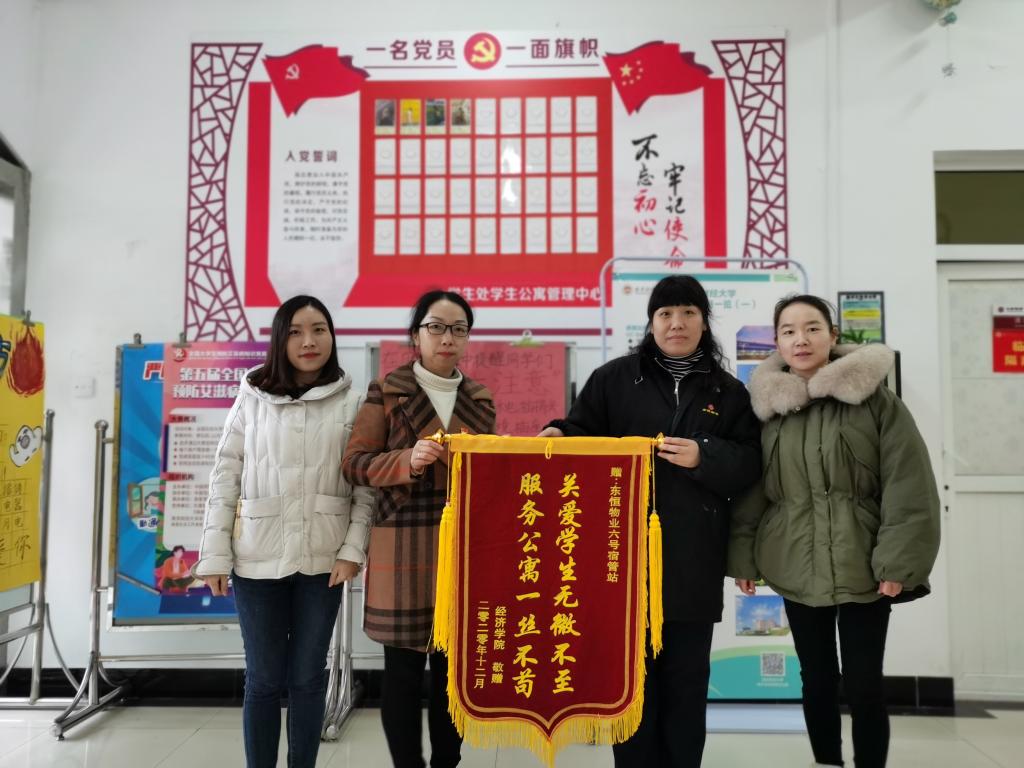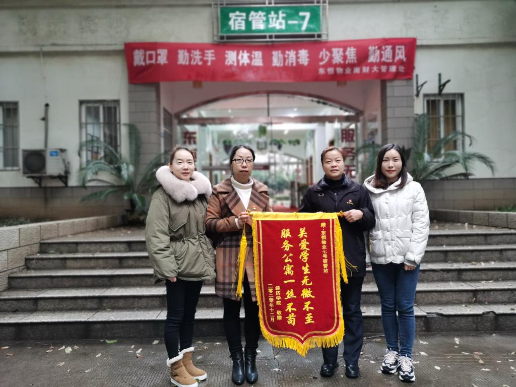 为感谢长期以来为学生成长提供贴心、暖心、细心服务,感谢疫情后学生未返校时,默默地帮学生晒被子、打扫房间、寄送物品;返校后又百般叮嘱及时开窗通风、早睡早起、锻炼身体、注意卫生的宿管阿姨们,12月29日上午,经济学院党委副书记袁怡琨一行来到西苑、中苑各宿管站,向经济学院学生所在1、3、4、5、6、7号宿管站阿姨赠送暖心锦旗。