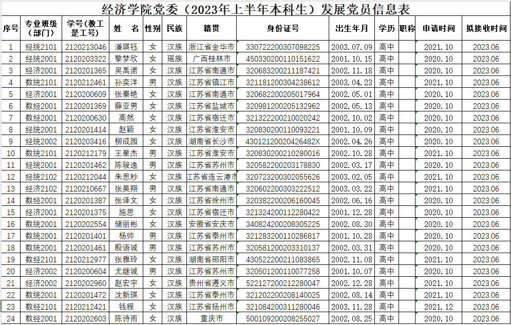根据《发展党员工作实施细则》有关规定,经学院基层党支部考察、学院党委预审,拟接收潘瑛钰等24名本科生人为中共预备党员。现予以公示: