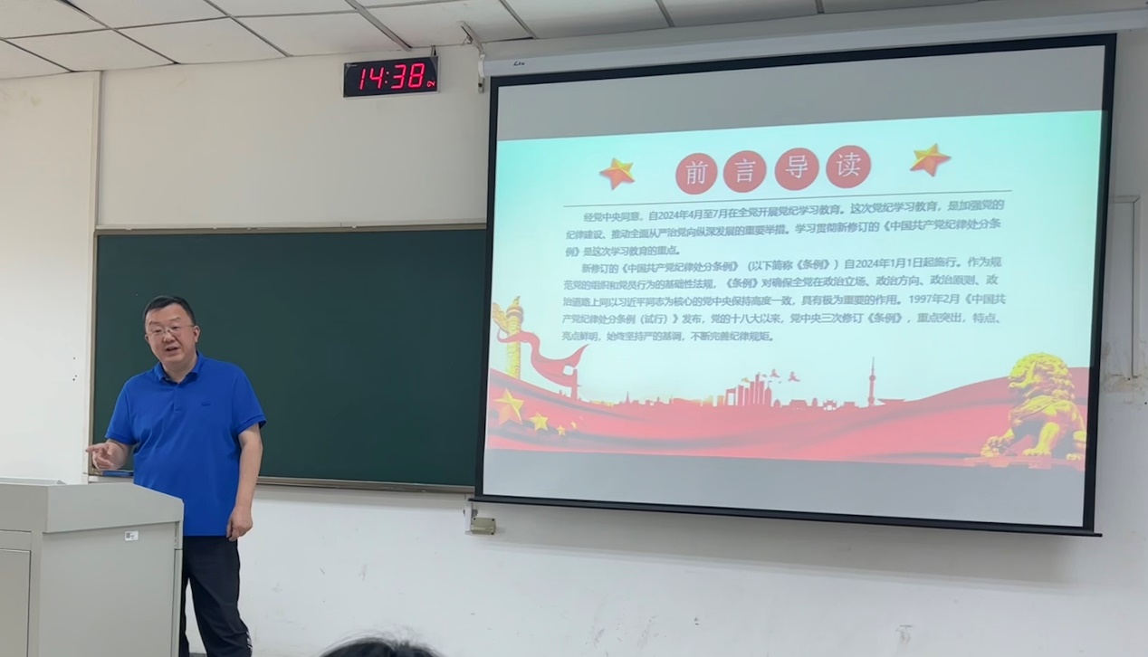 最后,支部书记汤美微总结,希望支部党员在对照纪律要求、进一步规范自身言行方面发挥示范作用,通过严明的纪律推动党的自我革命,持续提升自身的政治素养和防止腐败变质的能力。支部将以学习和贯彻《条例》视为重要的政治任务,努力真正做到学纪、知纪、明纪、守纪,以优良的纪律作风确保学院各项事业高质量发展。