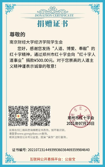 天灾突降,暴雨不歇,于此危急时刻,全国各地人们迅速增援河南,共克难关。“岂曰无衣?与子同袍。”即使无法赶到现场进行救助,经济学院学子仍然尽自己所能为抗洪防汛贡献力量。7月23日,南京财经大学经济学院学生会通过郑州红十字会向“红十字人道事业”捐款500元,呼吁经济学院乃至全校同学关注并全力支持河南抗洪。同时,经济学院还通过南京财经大学小经灵微信公众号等平台号召全体师生转发相关救助资讯与灾害防范知识,支援河南抗洪,关注南京疫情并积极进行志愿服务。