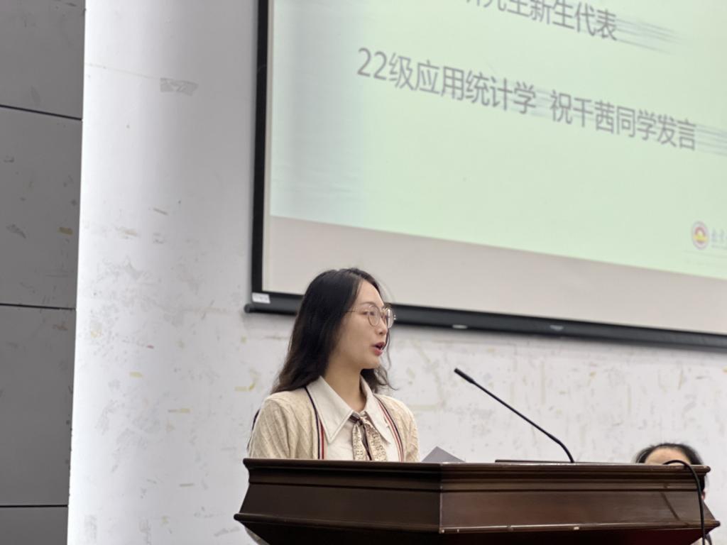 本科生在校生代表数统2001班桑海瑞从学校、学院、专业和生涯发展等四个方面和新生分享应如何度过大学四年。研究生在校生代表2020级经济思想史专业齐啸宇以南财校训与全体新生共勉,希望大家能在南京财经大学的沃土中,练就出过硬的本领,创造出更加辉煌的明天。本科生新生代表2201班赖嘉彝号召全体新生珍惜时光,把握机会,且行且思,不驰于空想,不骛于虚声。在对专业的潜心学习中,掌握知识,播种热爱,收获喜悦,不坠青云之志,永存赤子之心。研究生新生代表2022级应用统计专业祝千茜从自主性和创新性两个方面表达了对研究生阶段的向往和期待,希望在新的求学之路上活出卓越与非凡、充实与精彩。