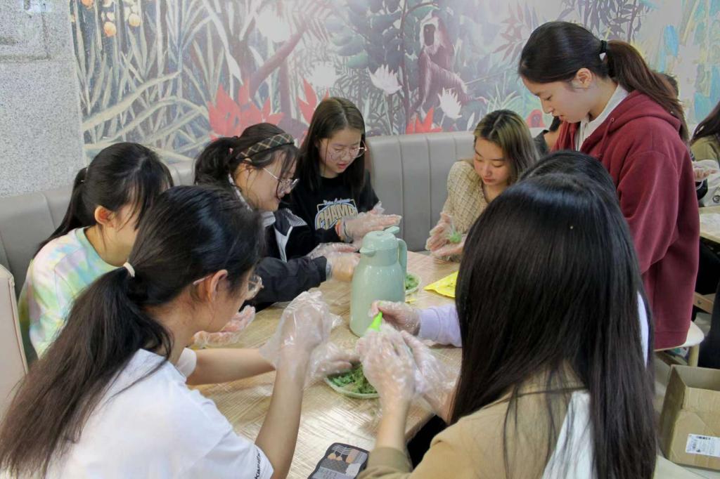 在和煦的午后,青团制作活动如火如荼地开始了。微风拂面,艾草的清香充盈在鼻息之间,活动主持人首先讲解了清明节的来历和风俗习惯,与大家分享清明节青团的历史小故事,随后仔细讲解制作方法,分好小组并分发材料.同学们纷纷跃跃欲试,迫不及待地想要做出可口的青团。同学们围坐在桌子旁边,挑选了自己喜欢的馅料,专心致志地制作青团,在青团粉中加入适量温开水,揉到不粘手的时候停止加水,然后反复揉搓成青绿色的面团,再将拌好的糯米团里包裹进豆沙馅,揉搓成一个圆球状的糕点。这样制作出来的青团不甜不腻,还带有清淡芬芳的青草香气。经济学院2204曹莹莹同学兴奋地说:“从来没有制作过这些传统食物,现在青团都是外面买的,借这次机会,不仅锻炼了动手能力,还深入了解了与青团相关的历史和文化。”
