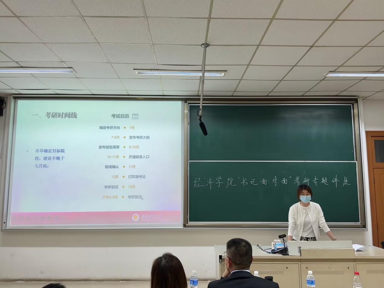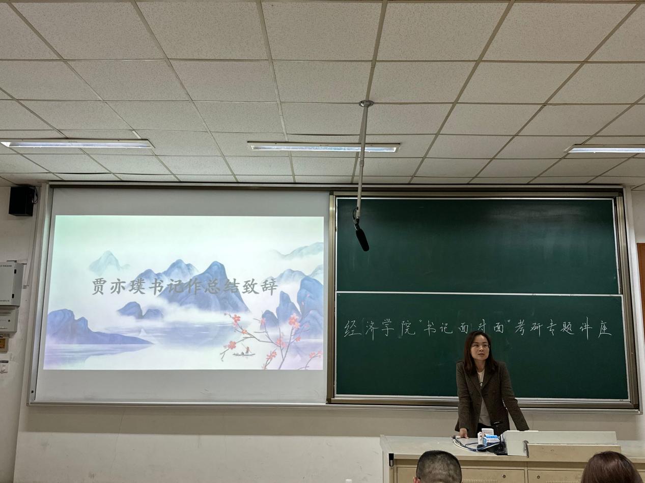 活动伊始,党委副书记贾亦璞老师就2023届毕业生考研情况、2023年经济学院招生规模以及2024届考研形势展开分析。她指出,同学们要理性选择考研院校和专业,并科学规划复习的路线图。她强调分享与传承的重要性,鼓励同学们加入学院官方考研交流群,积极交流想法、相互陪伴,分享考研的相关信息。