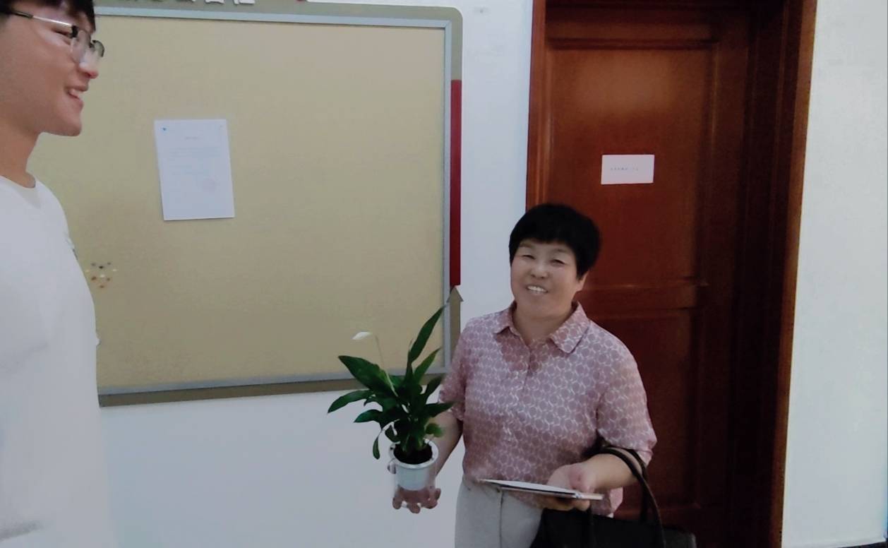 “郭老师,这个是白掌,它的花像一只白色的帆船,祝老师生活、工作都一帆风顺。”郭存芝教授在收到同学们的礼物后,和同学们亲切交谈并合影留念。