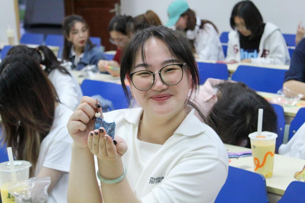 活动伊始,主持人与在场同学们共同学习了端午节的历史和由来,共同探讨端午节家乡的风俗习惯,现场氛围温馨融洽。随后,同学们将桌上摆放的五彩绳和香料等材料整理有序,并通过团队协作,精心制作出一件件色彩绚丽、独具匠心的五彩绳手串和香囊。在寄语环节,同学们纷纷写下对家人、朋友的节日祝愿:“愿端午安康!”“祝一举高‘粽’,学业有成!”“愿生活如粽子般甜甜蜜蜜!”这些温馨而真挚的寄语,不仅承载着同学们对中华优秀传统文化的深厚情感,也饱含了对幸福生活的无限憧憬和美好期待。在展示过程中,同学们互相赠送五彩绳和香囊,共同感受节日的温馨与文化的魅力,现场欢声笑语不断。