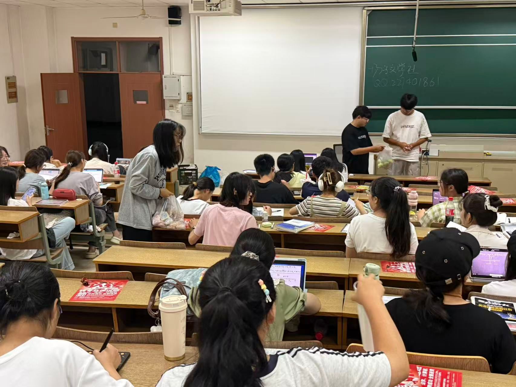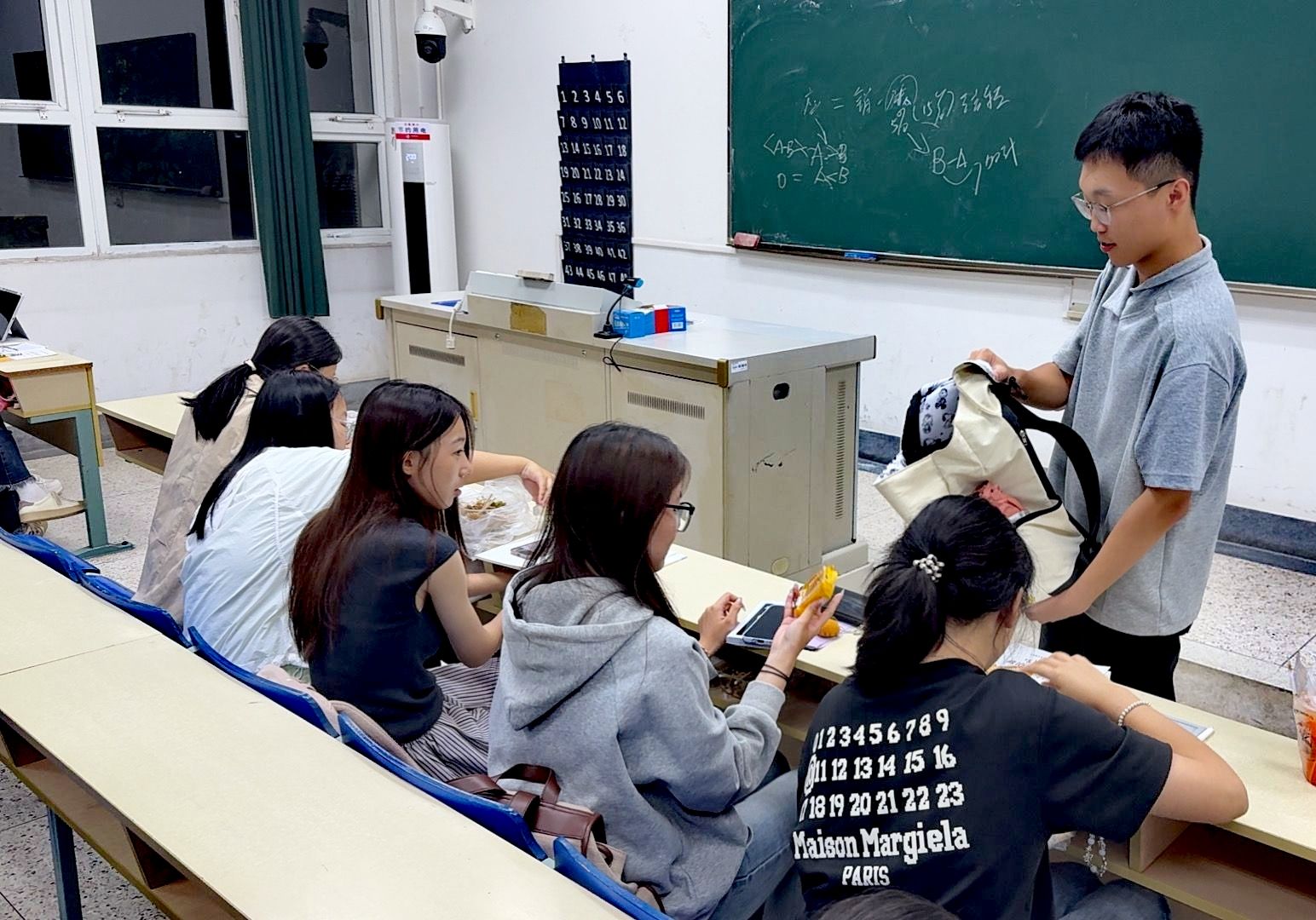 课桌上,月饼的香甜与水果的清新交织,摆着的不仅是舌尖的美味,更是学院沉甸甸的关切 —— 是怕异乡学子念家,特意准备的 “团圆味”,是想让每个人都能在校园里尝到节日的暖意。拿到这份惊喜的同学们,嘴角忍不住上扬,灿烂的笑容里,藏着对这份甜意的喜爱,更藏着被学院记挂的动容,那笑意落在眼底,比窗外的秋日阳光更显温暖。