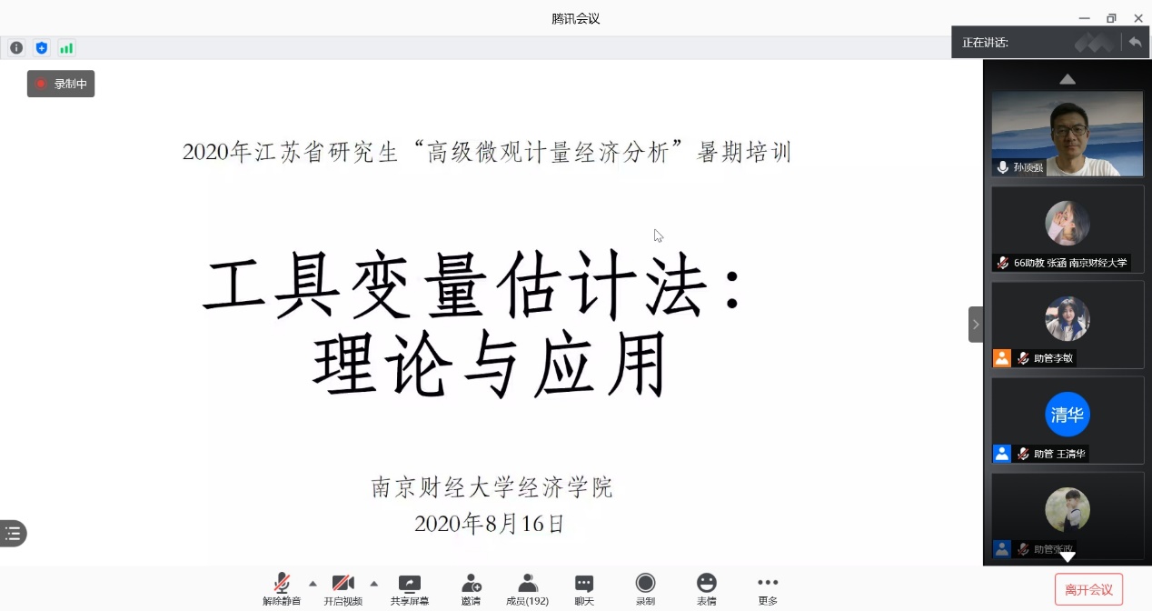 孙教授基于面板数据只能解决随时间不变的不可观测的遗漏变量问题,而无法解决随时间和个体变化的不可观测的遗漏变量问题,进而引出本次讲座主题——工具变量法。孙教授不仅系统地介绍了工具变量法、两阶段最小二乘估计及GMM估计的基本理论,还将理论与实际相结合,全面介绍了在使用工具变量方法过程中的五个潜在问题、检验方法及在Stata中的具体命令。最后,孙教授分享了该如何去寻找合适的工具变量的基本思路。讲座结束后,孙教授与学员们积极互动,耐心地回答学员们对工具变量法提出的疑问,讲解通俗易懂,学员们受益匪浅。