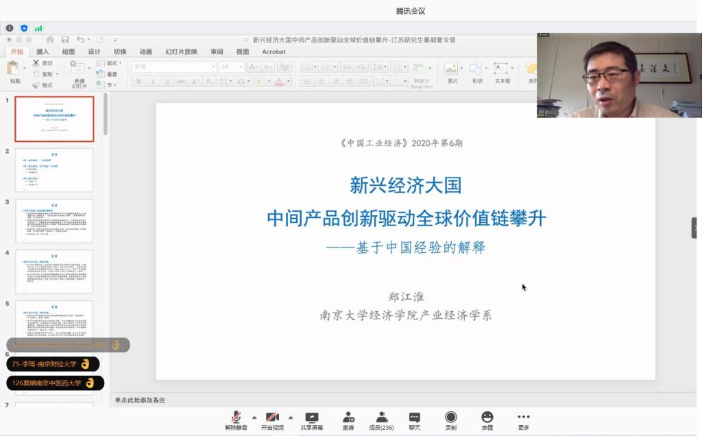 郑教授还与学员进行了深入的交流。郑教授对学员们所疑惑的各种问题,进行了详细的解答,引发了学员们在当前复杂国际格局下对全球价值链更深层次的思考。郑教授以形成国内经济增长大循环与全球化分工并不是此消彼长的绝对关系为例,告诫学员们,尤其是在科研中,要明确事情发生背后所蕴藏的机制,而不是笼统地抛出观点,并建议学员们多读文献,以便对自己当前所研究的问题形成理论框架。