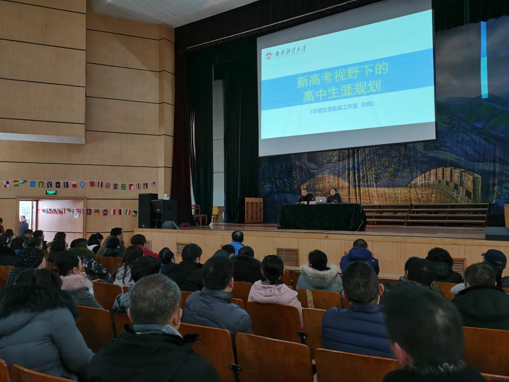 2021年,江苏省将启用新的高考招生制度。为了帮助高一、高二家长解读新版高考改革方案,12月21日,经济学院党委副书记袁怡琨老师带领招生咨询团队,前往我校优质生源基地——徐州市第一中学,走进该校“家长课堂”,开展主题为《新高考视野下的高中生涯规划》讲座,向高一、高二学生家长解读新高考政策,吸引200余名学生家长参加。