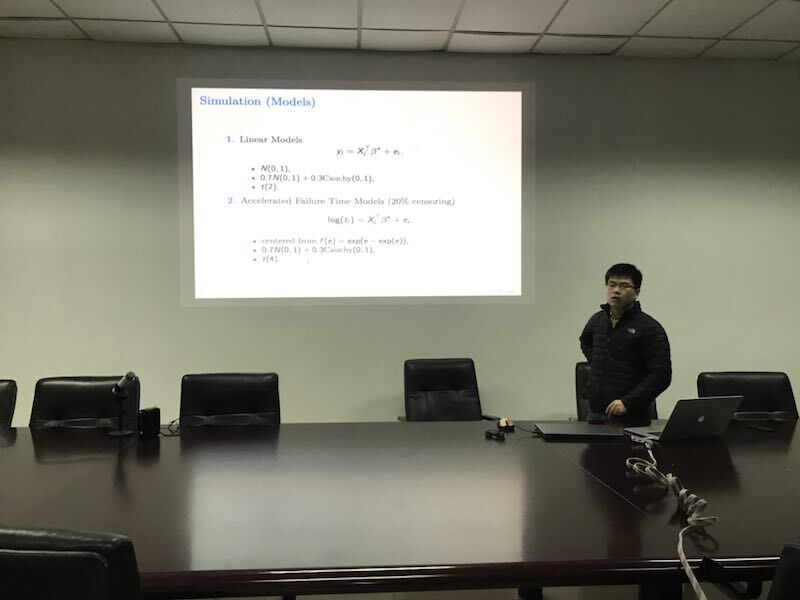 研讨会上,我院史兴杰教授以他的工作论文《高维非凸损失函数的分段前进后退算法》展开报告,详细介绍了分段前进后退算法以及它在高维非凸损失函数下的收敛性。通过模拟计算和实例分析,证明了该算法在处理高维统计模型以及进行非凸高维秩估计时具有良好的统计性质,同时具有降低计算难度、加快计算速度的优势。