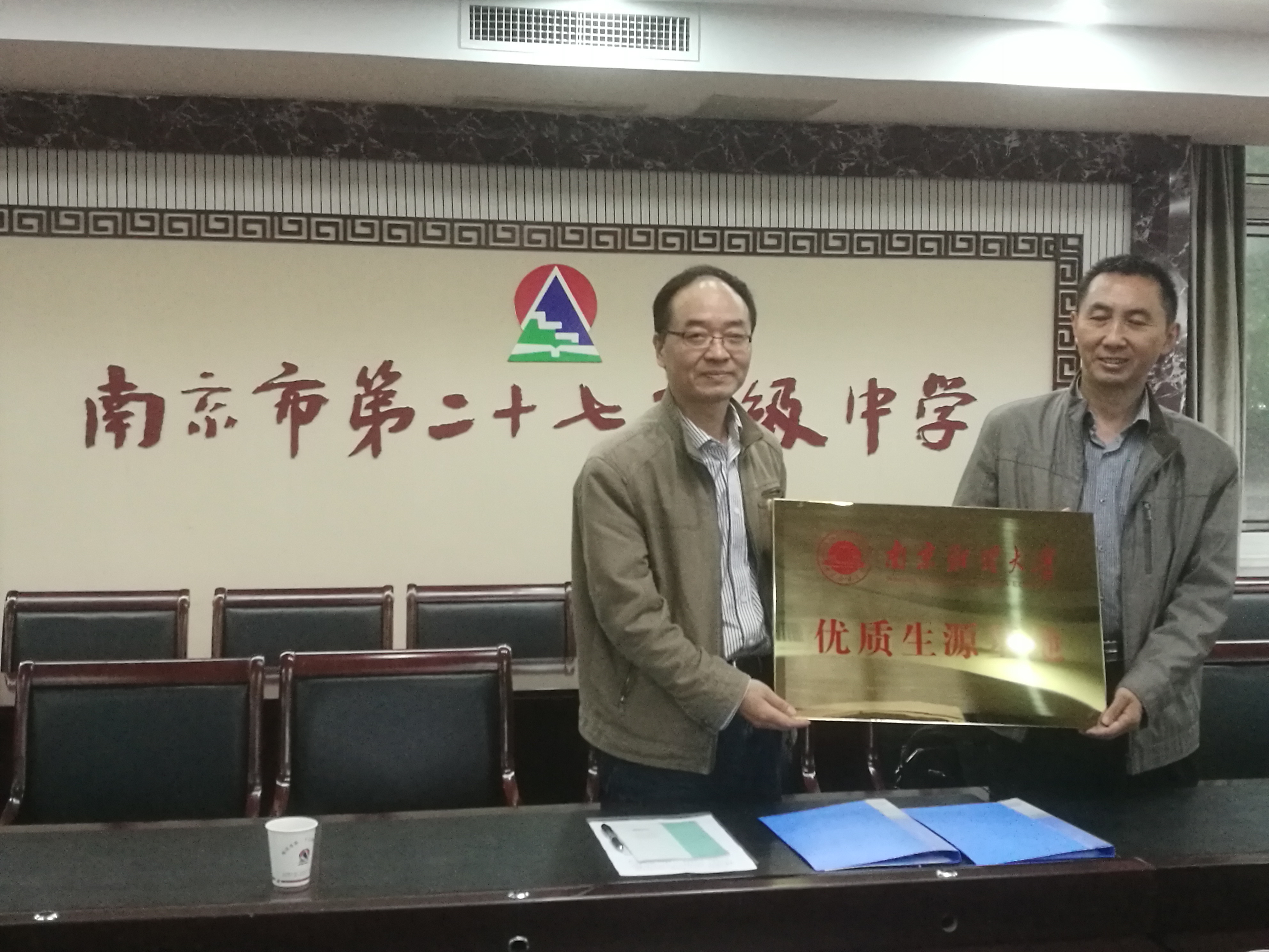10月26日上午,学生处处长姚学峰一行赴南京市第二十七中学出席“南京财经大学优质生源基地”签约授牌仪式。南京市第二十七中学校长吴卫兵、党委书记周桂茹、副校长鞠党生出席签约授牌仪式。我院党委书记陈耀辉、学生处副处长衣琳,二十七中校办主任许荣胜、团委书记陆祥等参加此次签约仪式。
