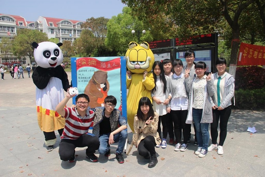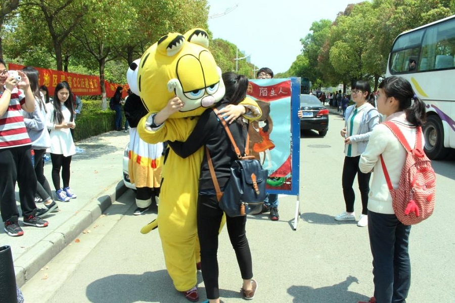 4月22日中午,由经济学院学生会举办的“你好,陌生人”温暖校园活动在学校西苑举行。穿戴可爱玩偶服的志愿者们举着“亲,来抱抱吧”和“我可以抱你吗?”的牌子,给来往的同学们送上拥抱。一个个温暖的拥抱,让情感在彼此间传递。