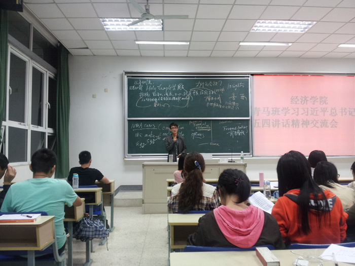 曾小强同学提到,总书记的讲话思想深刻,内涵丰富,语重心长,寄托着党对青年一代的殷切希望。青年一代肩负着光荣的历史使命,应当将“个人梦”融入“中国梦”,为中国梦凝聚青春力量,让“青春梦”与“中国梦”交相辉映。张美玲同学用自己的亲身经历介绍了她对于习主席讲话精神的理解,即热爱学习,勇于实践,敢于尝试,做时代的引领者。尹娜同学认为,年轻一代有青春,有梦想,有希望!作为希望,青年人应当了解国家的历史发展,敏锐感知时代的特殊性,以健康的心态面对生活,做最好的自己。陈栋同学说,“习主席的讲话给了我们莫大的信心,更激励着我们前进。”袁飙同学也表达了相同感想。承维同学结合习主席讲话精神,从点、线、面三个层次阐述了自己的体会,提出我们青年一代要全面发展,坚持理想,敢于实践。