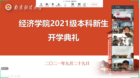 9月29日晚,我院2021级新生开学典礼以腾讯会议形式线上直播。院党委书记陈耀辉、院长朱红根、党委副书记袁怡琨、副院长崔向阳、尹敬东、韩中、学工秘书尹海燕、分团委老师兼辅导员梁少颖等参会。党委副书记袁怡琨主持典礼,2021级全体新生在各自的宿舍观看直播,线上参与。