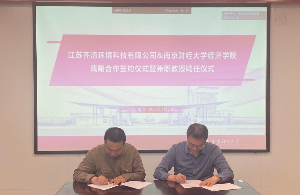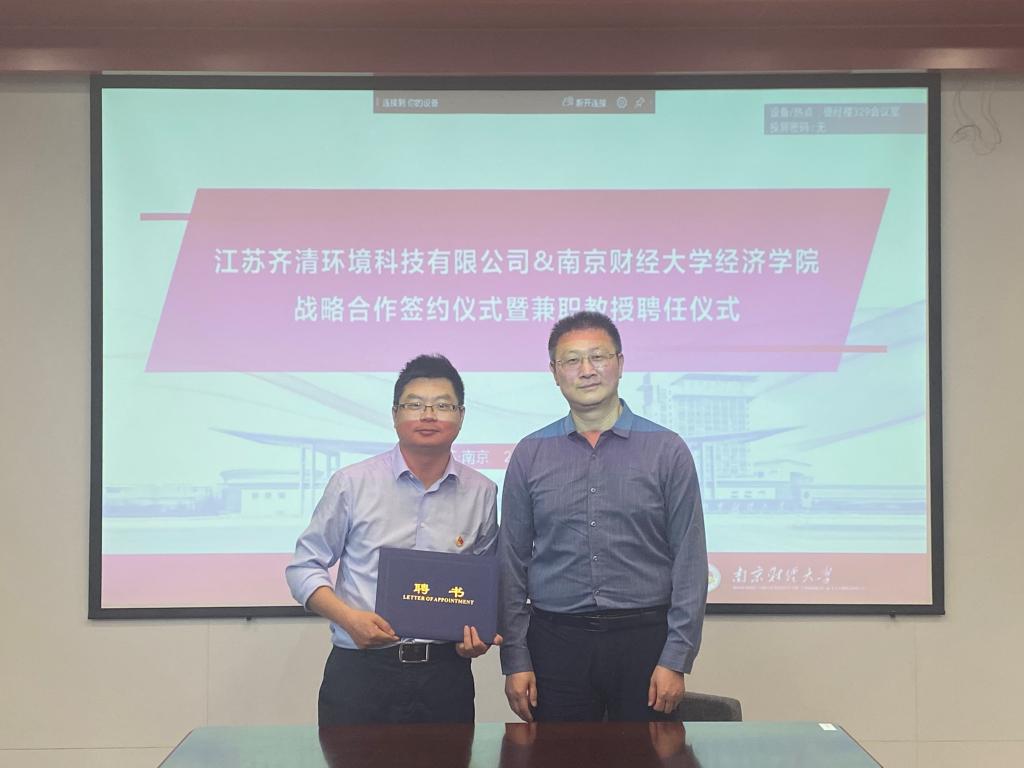 最后,朱红根院长与王志良董事长签署了《南京财经大学经济学院与江苏齐清环境科技有限公司战略合作协议》《南京财经大学经济学院与江苏齐清环境科技有限公司实习就业基地共建协议》,并聘任王志良董事长、李建军副总经理为绿色经济发展研究院兼职教授。根据协议,双方将在碳经济与管理交叉学科人才培养、师资队伍建设,碳经济理论与实践研究,流域环境治理、生态环境政策咨询,实习就业基地建设等方面开展深入合作。