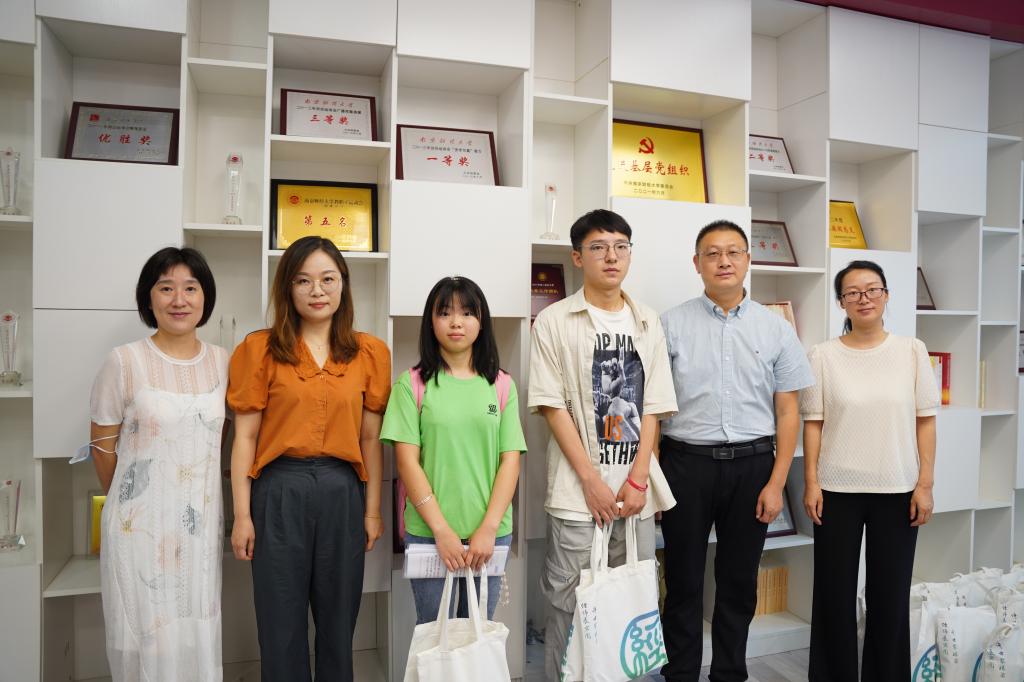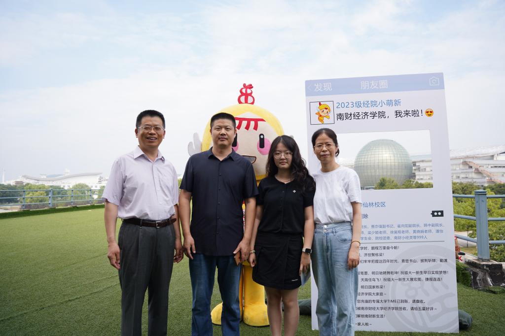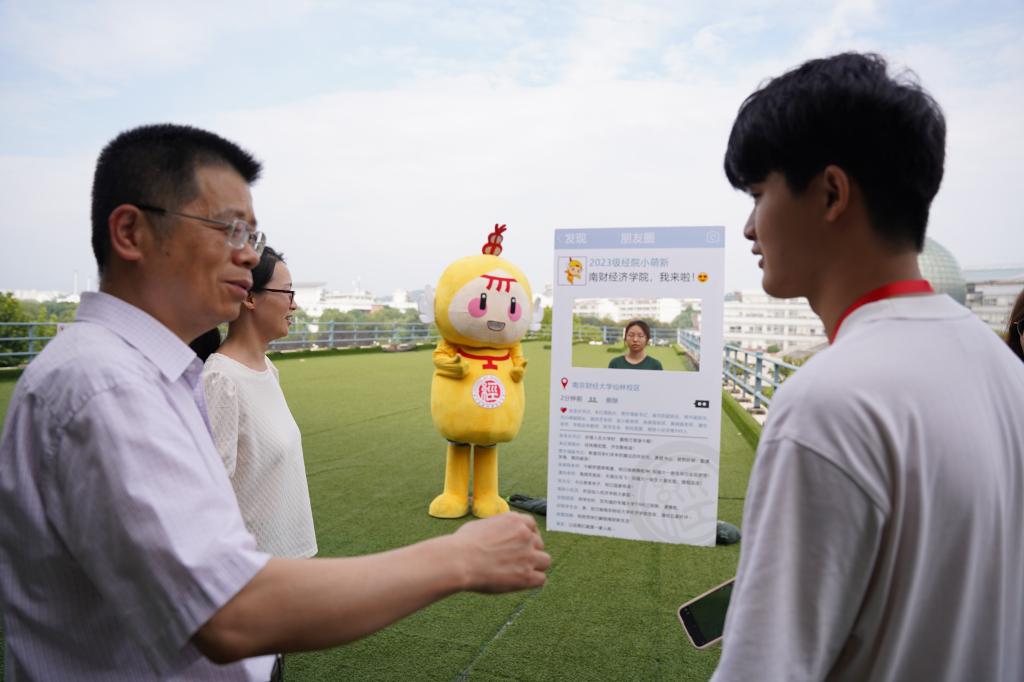 我院领导与新生及家长在写满学院领导老师点赞留言的朋友圈打卡框旁合影