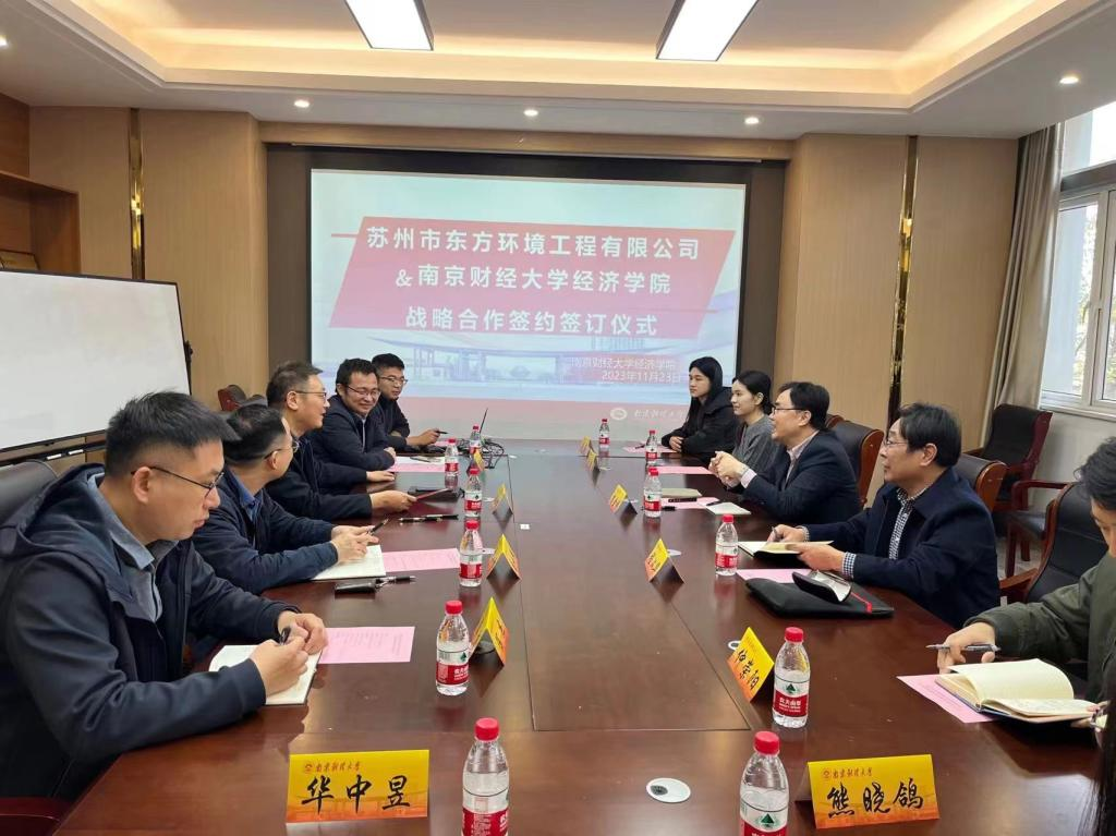 朱红根院长与李金明董事长签署了《南京财经大学经济学院与苏州市东方环境工程有限公司战略合作协议》。根据协议,双方将在碳经济与管理交叉学科人才培养、师资队伍建设、碳经济理论与实践研究、流域环境治理、生态环境政策咨询、实习就业基地建设等方面开展深入合作。