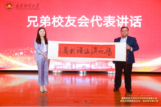 南京校友会会长张先平先生致辞,他表示各兄弟校友会加强联系、紧密合作,共同推进南京财经大学发展。张先平会长代表南京校友会向经济学院校友会捐赠书法作品“扬帆济海谱新篇”,对经济学院校友会成立表示衷心祝贺。经济学院校友会还收到来自上海、重庆、四川、镇江、无锡等地方校友会和食品科学与工程学院校友会、会计学院校友会等兄弟学院校友会的祝贺。