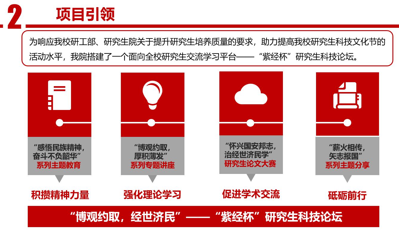 我院举办的“紫经杯”研究生科技论坛共分为四个部分。第一部分是“感悟民族精神,奋斗不负韶华”系列主题教育活动,旨在帮助同学们积攒精神力量,点燃青年学生对于接棒新时代、承担祖国复兴重任的热情之火;第二部分是“博观而约取,厚积而薄发”系列学术讲座,旨在帮助同学们强化理论学习,拓宽学术视野;第三部分是“怀兴国安邦志,治经世济民学”研究生论文大赛,旨在给同学们提供一个展示自我、交流学术的平台;第四部分是“薪火相传,矢志报国”系列主题分享会,旨在启发同学们认清前路,砥砺前行。
