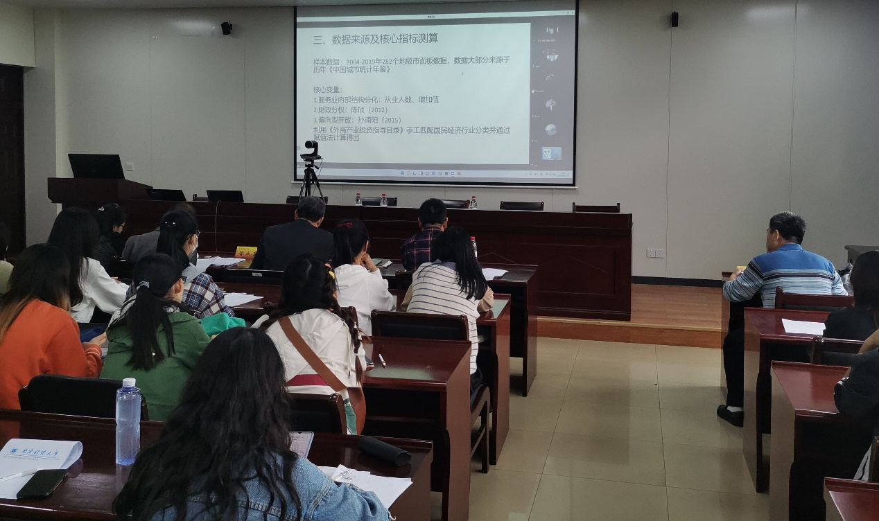 10月11日下午,第二届“紫经杯”研究生科技论坛学术论文大赛决赛在经济学院307会议室举办。本次论文大赛的主题是“经世立民,抒我见解——双循环新发展格局下中国经济高质量发展的理论与实践”,面向全国各高校财经类专业研究生征集优秀学术成果。论文大赛采用线上线下相结合的模式进行,参赛选手通过腾讯会议线上答辩,评委老师现场连线指导,经济学院全体研究生现场观摩学习。研究生院副院长、学位办公室副主任管永昊受邀担任评委,经济学院副院长崔向阳、副院长尹敬东、党委副书记袁怡琨、统计学学科带头人白先春参加活动。活动由经济学院副院长崔向阳和经济学院研究生会主席姚阳阳主持。