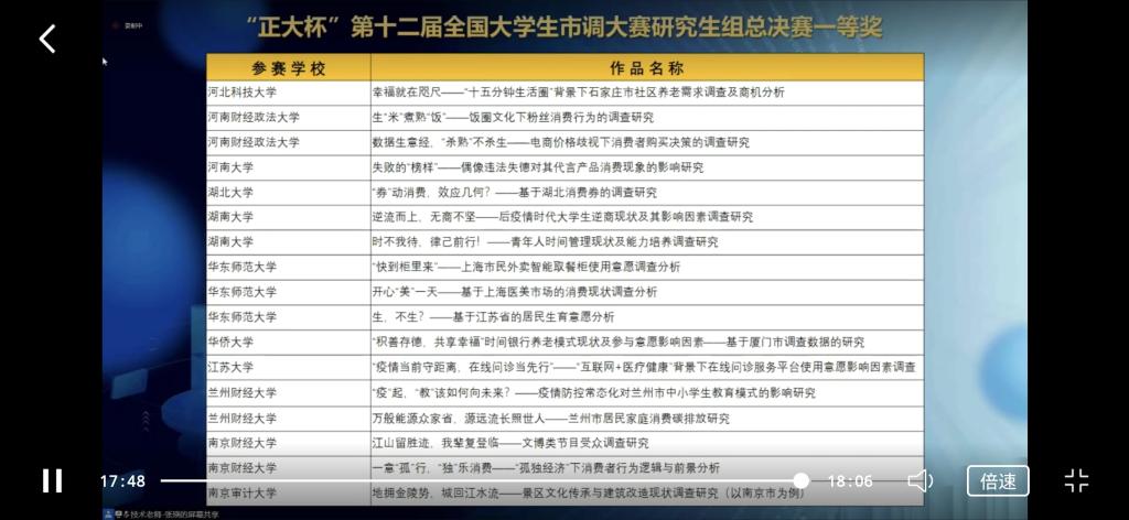 5月14日至15日,由中国商业统计学会主办、华东师范大学承办的“正大杯”第十二届全国大学生市场调查与分析大赛(研究生组)总决赛在线上举行。经过激烈角逐,我校获一等奖2项、二等奖1项、三等奖7项,展现了我校研究生的青春风采和创新能力。