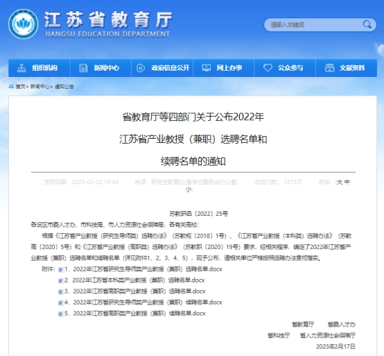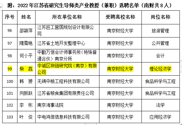 日前,江苏教育厅、省委人才办、省科技厅、省人力资源社会保障厅印发《省教育厅等四部门关于公布2022年江苏省产业教授(兼职)选聘名单和续聘名单的通知》(苏教研函〔2022〕25号),我院新增1个江苏省产业教授,即:中诚区块链研究院(南京)有限公司的柴荔。