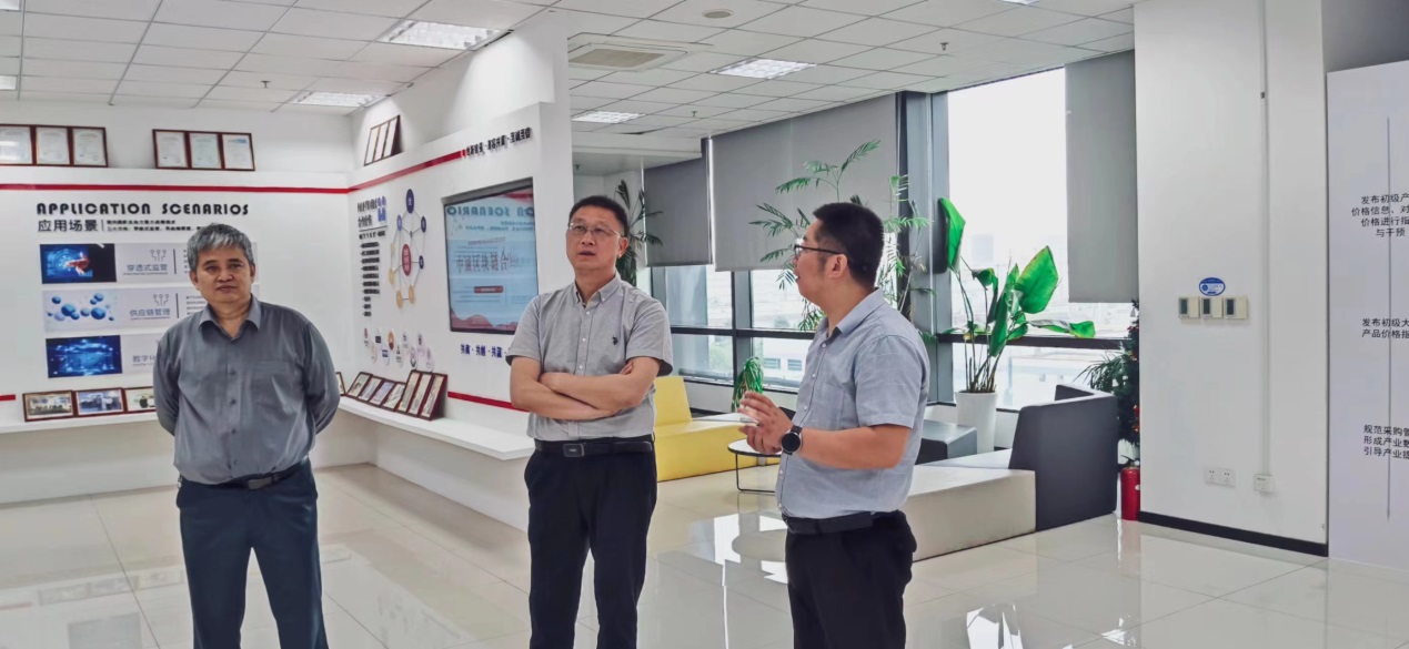 中诚区块链研究院汪洋总经理对我院领导的到来表示热烈欢迎,并带领朱红根院长一行参观了中诚区块链研究院(南京)有限公司展厅,详细介绍了中诚区块链研究院的发展背景、基本情况及在金融监管、数字农业方面的应用场景。