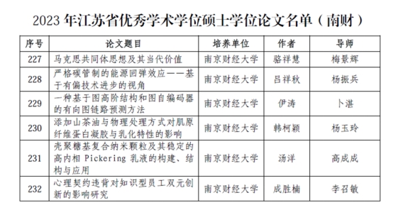 根据《江苏省优秀博士硕士学位论文评选实施办法》,省优硕士学位论文评选每年进行一次,按照不超过当年研究生毕业人数1.5%的比例,进行省优秀硕士学位论文评选,硕士学位论文评优比例不超过1%。省优硕士学位论文代表了江苏省在学术型硕士人才培养方面的最高水平,我院继2022年获得1篇省优学术学位硕士学位论文后,2023年再次连续获得省优学术学位硕士学位论文,充分彰显了我院研究生的青春风采和指导教师的学术水平。