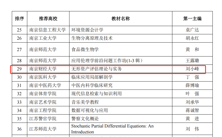 近日,2024年度江苏省研究生优质教学资源评选结果正式公布,我院院长刘小峰教授主编的《无形资产评估理论与实务》教材成功入选,这一成果不仅彰显了我院在研究生教育领域的深厚积淀,也为学院学科建设和人才培养再添新动力。