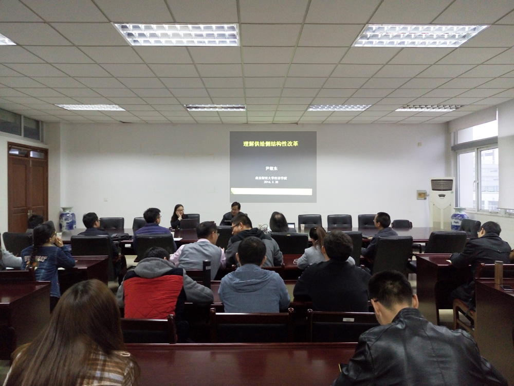 2016年3月30日晚, 我院“长三角收入分配与经济增长”学术论坛再次开讲,我院副院长尹敬东教授就我国当下的经济热点问题 “供给侧结构性改革”进行学术报告。我院部分教师和研究生参加了本次学术活动,讲座由我院王万珺老师主持。