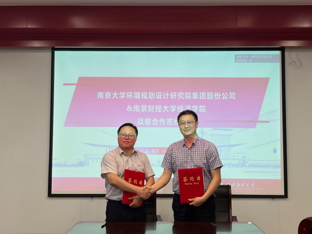 最后,朱红根院长与吴俊锋常务副总裁签署了《南京财经大学经济学院与南京大学环境规划设计研究院集团股份公司战略合作框架协议》,并聘任吴俊锋常务副总裁为绿色经济发展研究院兼职教授。根据协议,双方将碳经济与管理交叉学科的课程研发、人才培养和师资建设,在环境治理、环境政策咨询,碳经济理论与实践研究,科研平台建设与实习就业基地建设等方面开展深入合作。