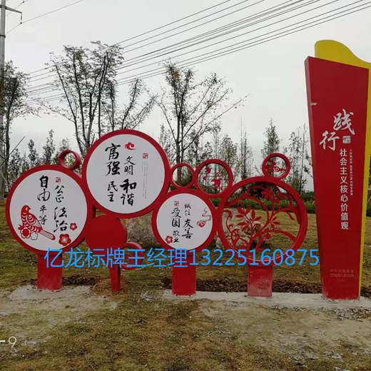 社会主义核心价值观标识牌多呈红色,红色是中国古老和传统的色彩,象征着中国上下五千年的血脉传承。红色也代表热情和正义,传达一种蓬勃向上的进取精神,弘扬社会主义文明和风尚,彰显中国特色社会主义的道德文化。其设计要从我国传统文化还有当地的文化特色中汲取营养和灵感,从中提炼出各种抽象具象的符号或者图案造型应用到核心主义价值观标牌的设计当中去。