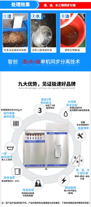 处理量:400KG/h 装机总功率:3980W 排料方式:固液分离 运行噪音:65db 运行模式:自动化