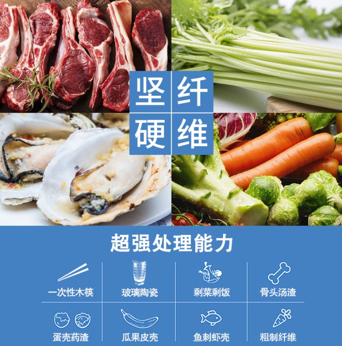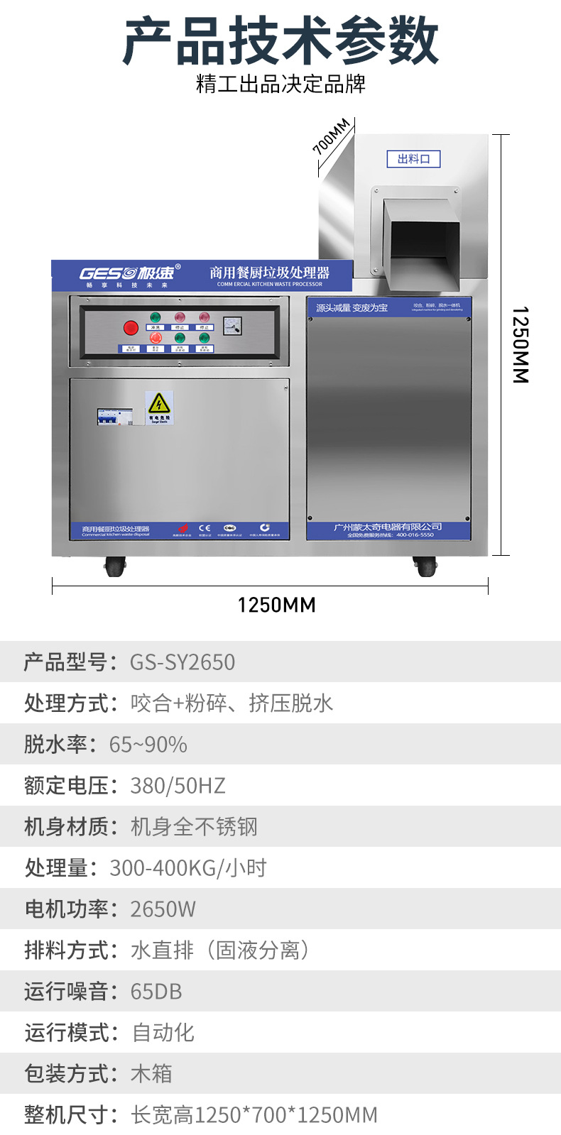 日处理量:2吨 电机功率:4150W 排料方式:直排(固液分离) 运行噪音:65db 运行模式:自动化 包装方式:木箱