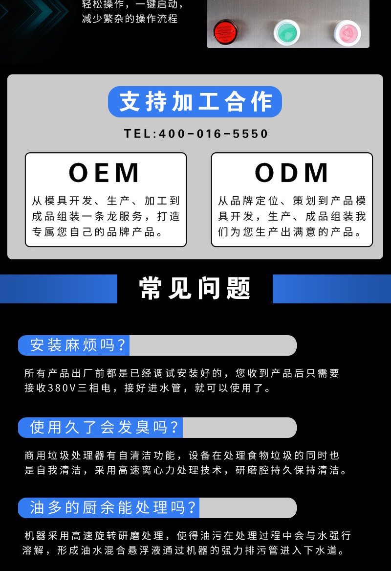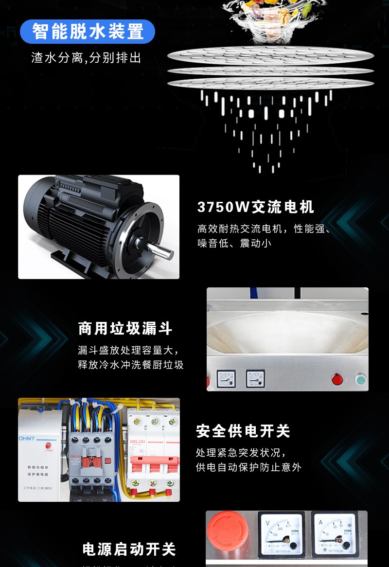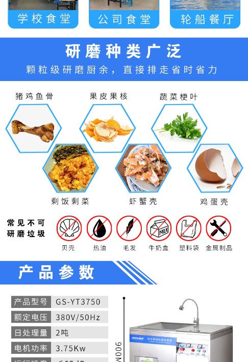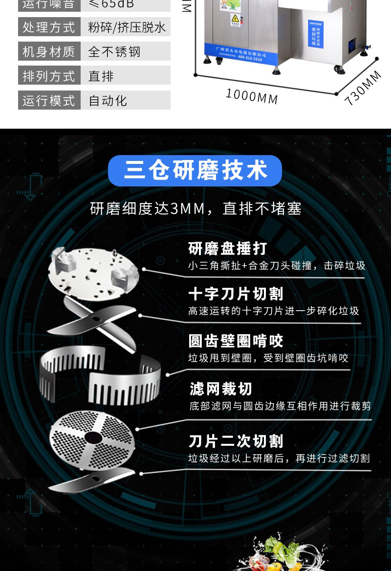日处理量:2吨 电机功率:4100W 排料方式:直排(固液分离) 运行噪音:65db 运行模式:自动化