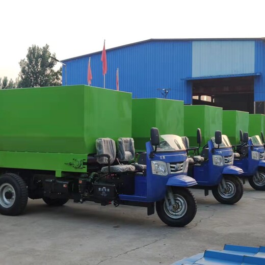 撒料车分为三轮车和撒料系统两部分组成,三轮车主要从事运输行走及撒料动力,撒料系统是通过主输送和小输送带动完成投喂。