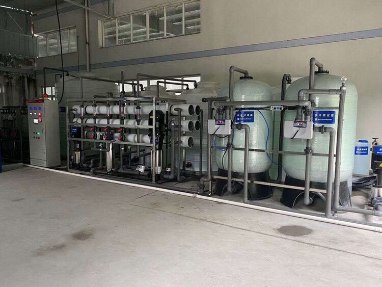 原水→原水加压泵→多介质过滤器→活性炭过滤器→软水器→精密过滤器→反渗透机→中间水箱→中间水泵→EDI系统→纯化水箱→纯水泵→紫外线杀菌器→微孔过滤器→用水点