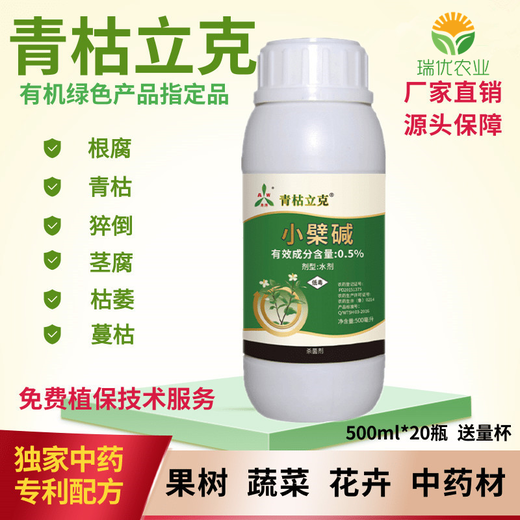 1.灌药时,每株用水量以灌透为宜(苗期需100—200ml左右;花期、结果期需200—500ml,具体根据植株生长时期、土壤干湿度而定)。 2.病情严重,植株长势弱时,可同时使用《海藻生根剂——根基宝》(禁止与叶片接触)300倍液进行灌根,促进根系生长,强壮植株,提供抗病能力。 3.用药期间,应控制浇水。 果树版: 在早春和夏末进行扒土晾根,刮治病部或截除病根,然后使用《青枯立克》300倍液稀释灌根,同时喷施《海藻生根剂——根基宝》300倍液效果更佳。 五、产品优势: 1.杀菌广谱、不破坏土壤结构、维持生态平衡。 2.营养保健:在防病治病的同时能补充作物营养,增强植株免yi力,从根本解决土传病害的危害。 3.长期使用无抗药性、、用药安全、不影响产品的绿色标准。