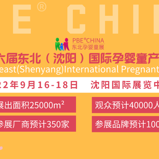 东北(沈阳)国际孕婴童产品博览会(简称:“东北孕婴童展”或“PBE CHINA”)将于2022年9月16-18日在沈阳国际展览中心举办,东北孕婴童展是目前东北地区的孕婴童产品博览会,已发展成化、品牌化、国际化于一体的性展会。同期还将举行各种交流会、新品发布会、高峰论坛等活动。为母婴用品、服装及配件、食品及保健品、奶粉、玩教具、童车婴车等孕婴童产品聚集在同一平台展示,其一顺应了行业发展趋势,也便于供需双方开展、深层次的贸易洽谈。把自己的产品近距离展示给全国众多经销商、零售商、大型商超、超市、孕婴童门店、电商平台、终端消费者等。全力打造东北地区具影响力孕婴童行业采购贸易交流平台,提升行业产品度、加强同行业之间交流与合作。预计本届展会汇集近350家企业,参展品牌上千个,观众预计40000人次,