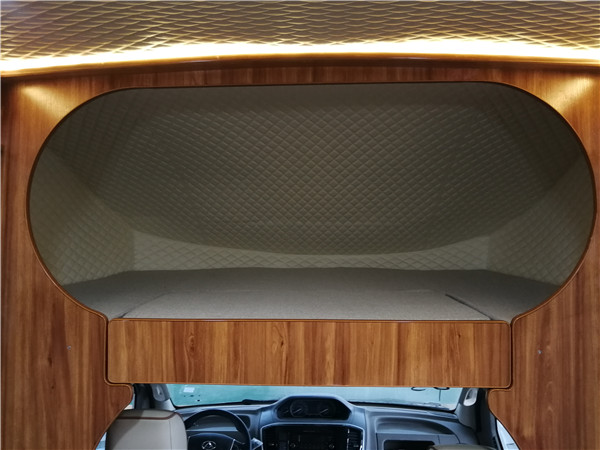 房车的前方是车辆的驾驶室区域.上面就是房车额头床.可以睡两个人没有任何问题.床下面就是房车的液晶平板电视 当驻车时将额头床的床板掀起就可以看电视了.