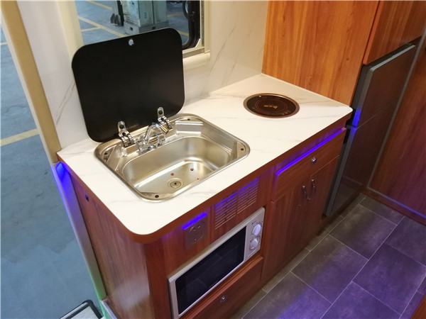 开放式厨房配备电磁炉,两用洗菜盆,房车油烟机,车载微波炉、冰箱,等厨房用具,人性化储物柜设计,内部空间划分合理,日常烹饪需求得到大化满足