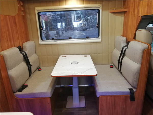 会客区采用的是两座对向四人座沙发,中间配有一张可升降的小餐桌。这样舒适的座椅,不仅填充物饱满,而且具备调节功能,比普通房车那种直愣愣的沙发座椅,舒服了100倍。而且夜晚休息的时候,此处也是能够拼成床铺的。