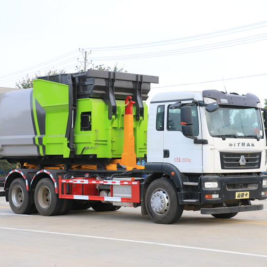 重汽汕德卡后双桥套臂垃圾车配移动垃圾箱国六18方