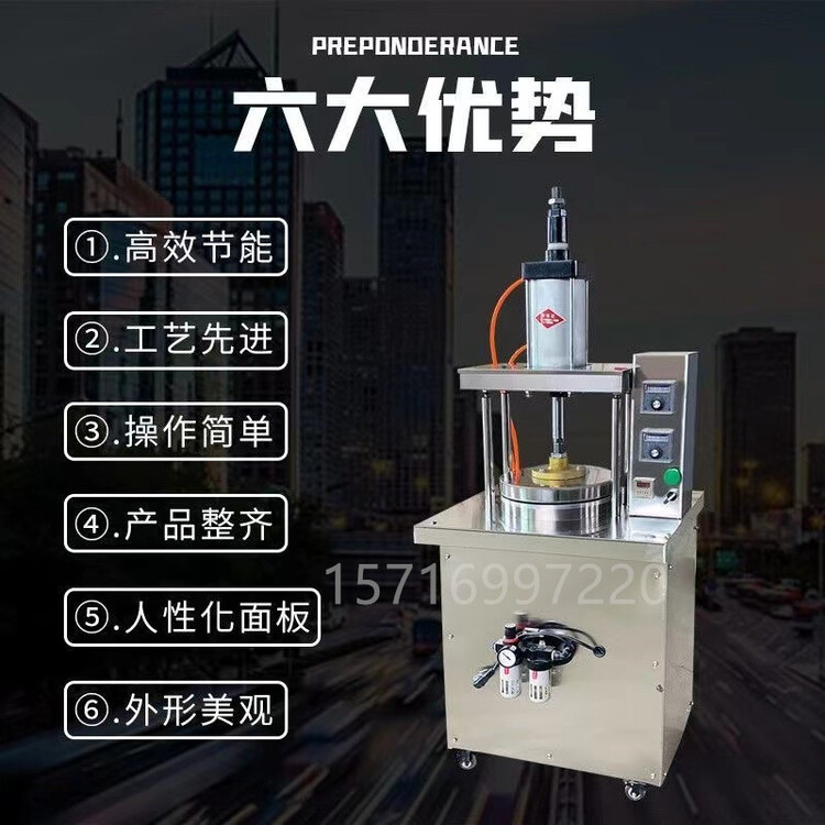 设备采用电脑控温,上下模具可自行调节不同温度,从而制作不同的饼皮和烙制印花等。设备制作选择了一键启动方便操作,简单易学,只需要按下开关,设备自动运行,自动停止。饼皮压制成型后,我公司同时配备鏊子,饼皮压制出来属于半成熟状态,放在鏊子上使其饼皮完全成熟。