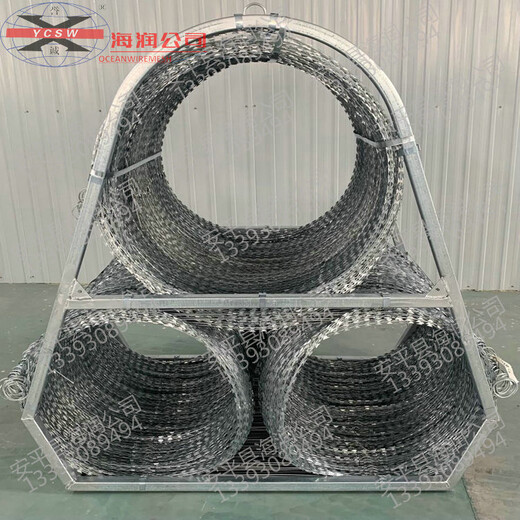 品字形刺网,三圈式刀片刺网,品字形刀刺滚笼是由安平县海润丝网织造有限公司研发、制造而成,其结构是由三圈刀片刺绳经过特殊加工组合而成,使用时成品字型结构,用于特殊场合进行有效、隔离,实现区域封闭控制,可有效的防止人群跨越、攀爬及冲撞,可阻挡交通工具强行通过、冲卡,广泛适用于临时隔离,边境哨卡,机场仓库周边设防、警戒及隔离。