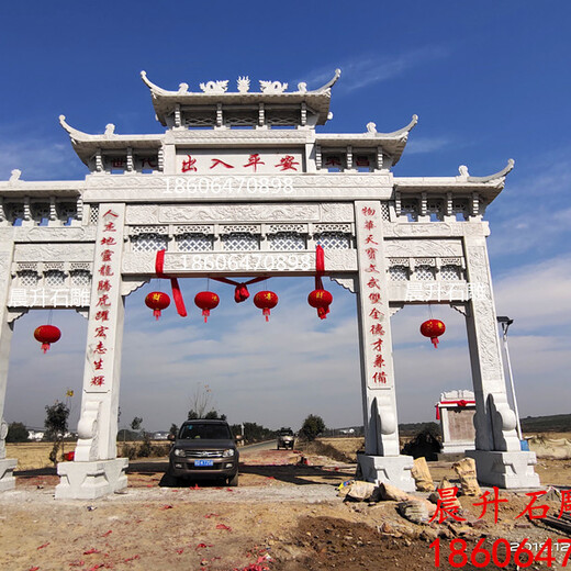 村口大门牌楼价格是多少,关键在于石牌楼雕刻原材料及其加工工艺复杂具体情况来定价。各种原材料成本也是要充分考虑到的,当然在其中绝大多数部分是石材原材料的价格。在考虑到价格的时候,肯定是要考虑到石牌楼的造型设计,不一样的造型设计规格型 在价格上面有不一样,依据实际的雕刻造型设计给出相应的价格,客户可以依据不一样的造型设计价格来明确自己的选择。