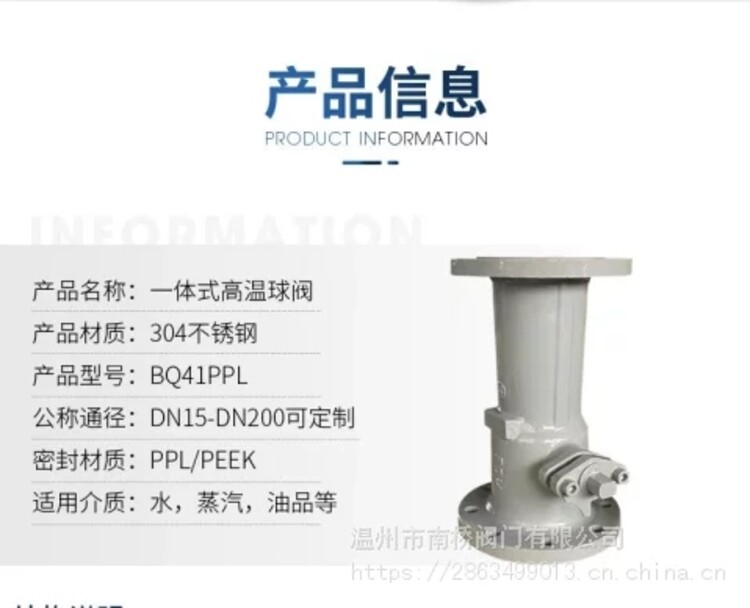一、简介:温州市南桥阀门有限公司是一家一体式高温球阀,旋塞阀,闸阀,截止阀生产厂家,由本厂自主研发生产的{一体式球阀}质量可靠、售后服务完善。『高温球阀』适用于各种轻重工业及楼宇管道。【球阀】应用于:化工、石化、石油、造纸、采矿、电力、液化气、食品、制药、给排水、市政、机械设备配套、电子工业,城建等领域。