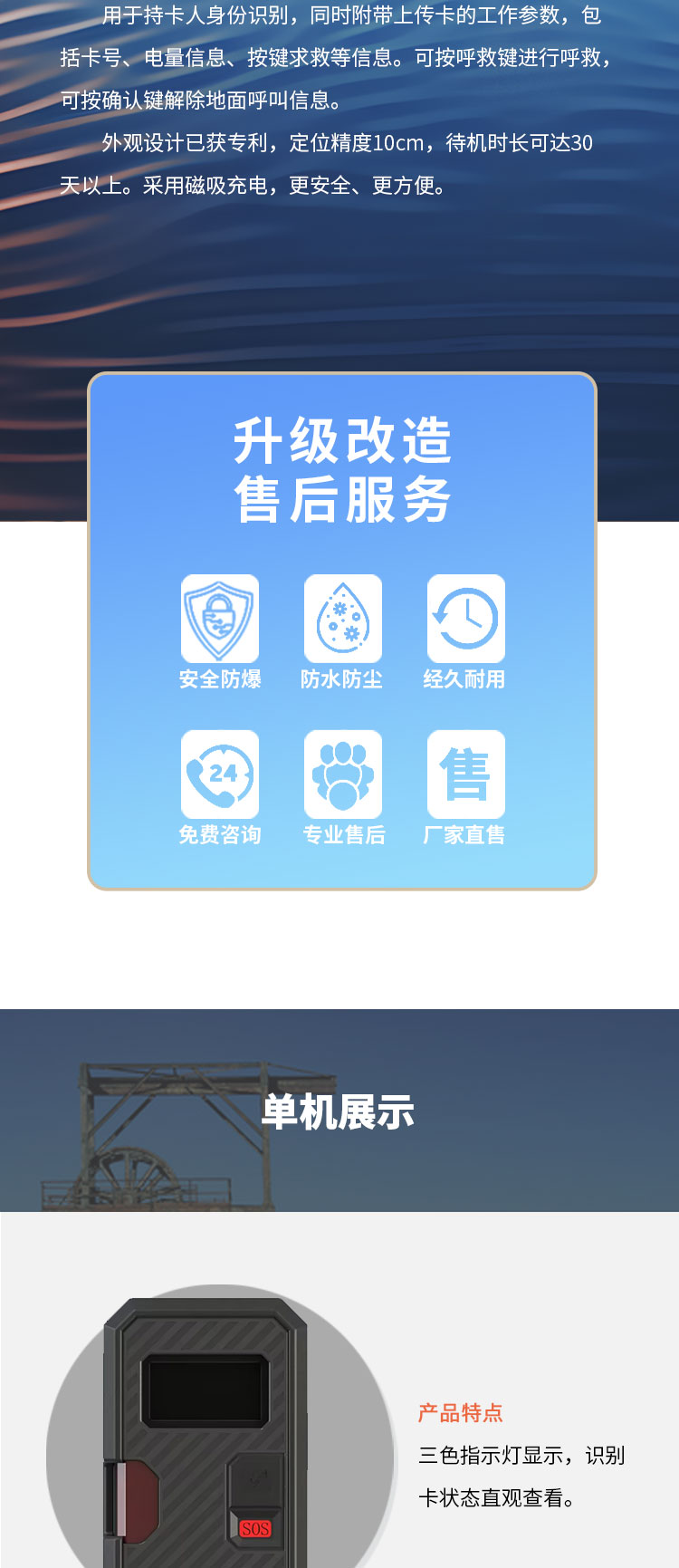 KJ725(A)-K1标识卡,用于持卡人身份识别,同时附带上传卡的工作参数,包括卡号、电量信息、按键求救等信息。可按呼救键进行呼救,可按确认键解除地面呼叫信息。