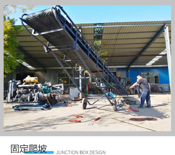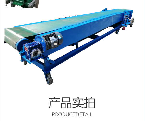 可移动式皮带输送机是一种工效高,使用,机动性好的连续输送装卸设备。主要用于装卸地点经常变更动的场所,如:港口、码头、车站、、仓库、建筑工地、沙石料场、农场等,用来短途运输及装卸散料或单件重量100公斤以下的成件物品。DY型移动式胶带输送机分为可升降型及不可升降型两大类,输送带的运行靠电动滚筒驱动,整机的升降与运行均为非机动。