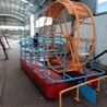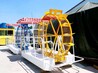 外形突破了常规的船设计,通过人里踩踏风车来波动水、进而船再向前走动。